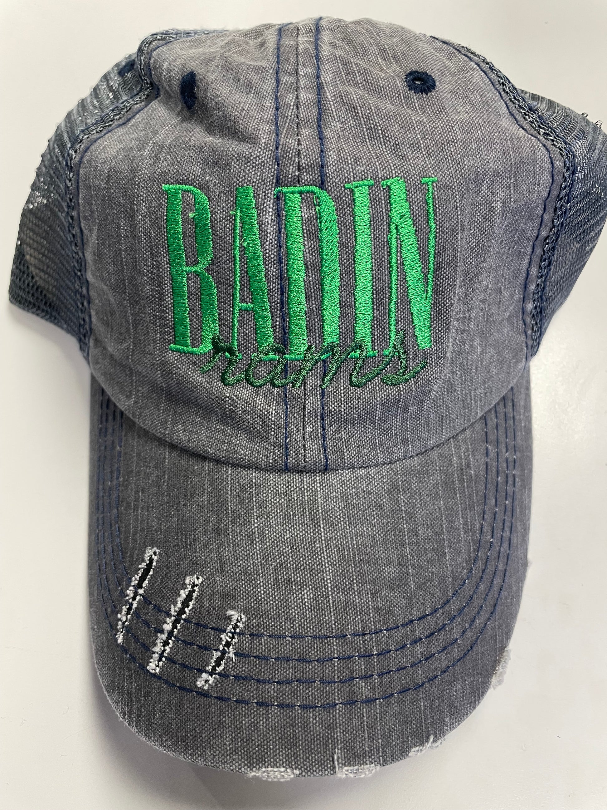 BADIN Rams embroidered baseball cap. Cap is a distressed charcoal gray.